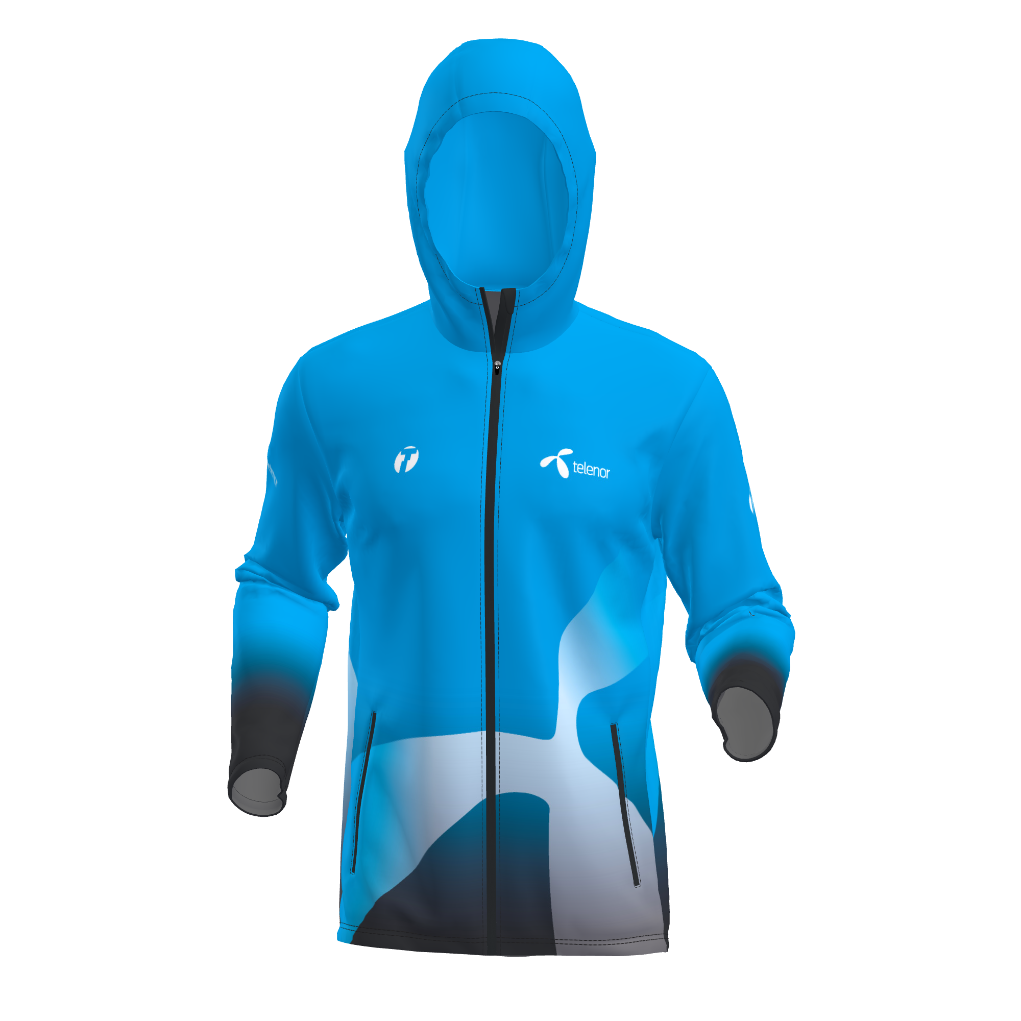 Hettejakke med en lang glidelås i front med hakebeskyttelse øverst.